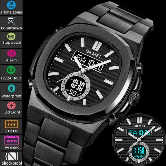 Skmei Analog Digital Display Mens Bracelet Watches Three Time Zone LED Waterproof Quartz Sports Chronograph Male Alarm Clock